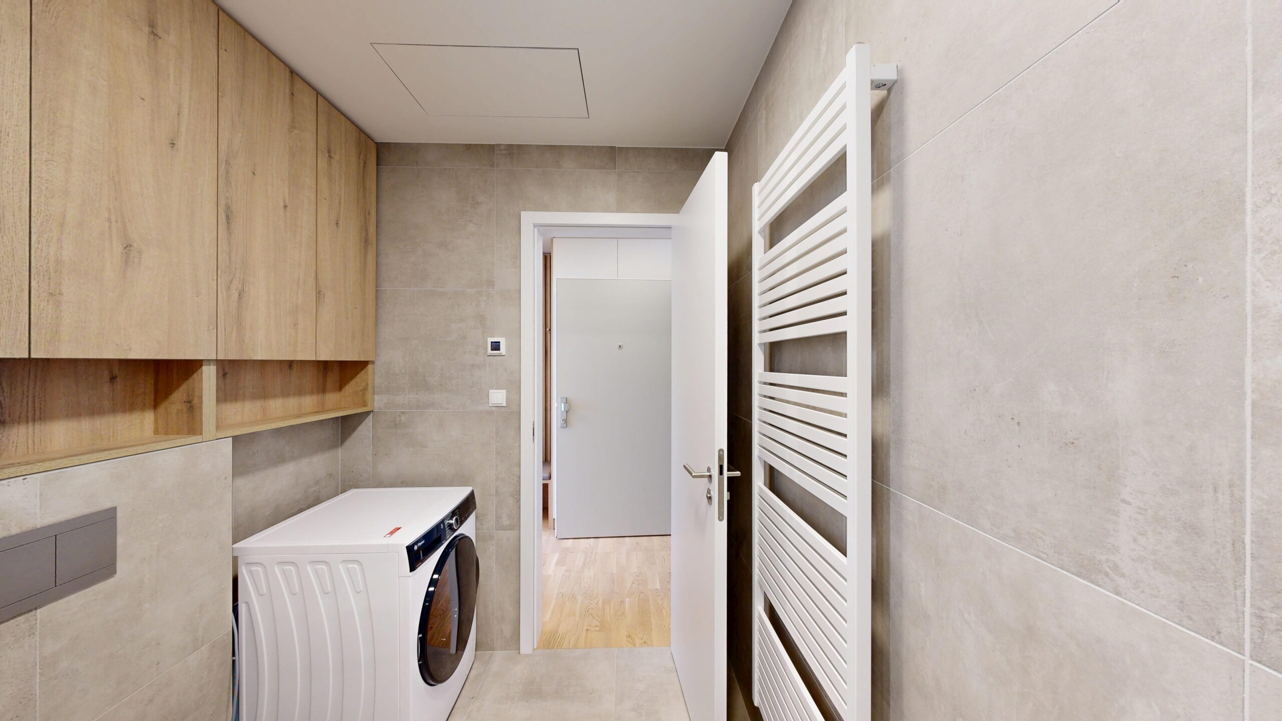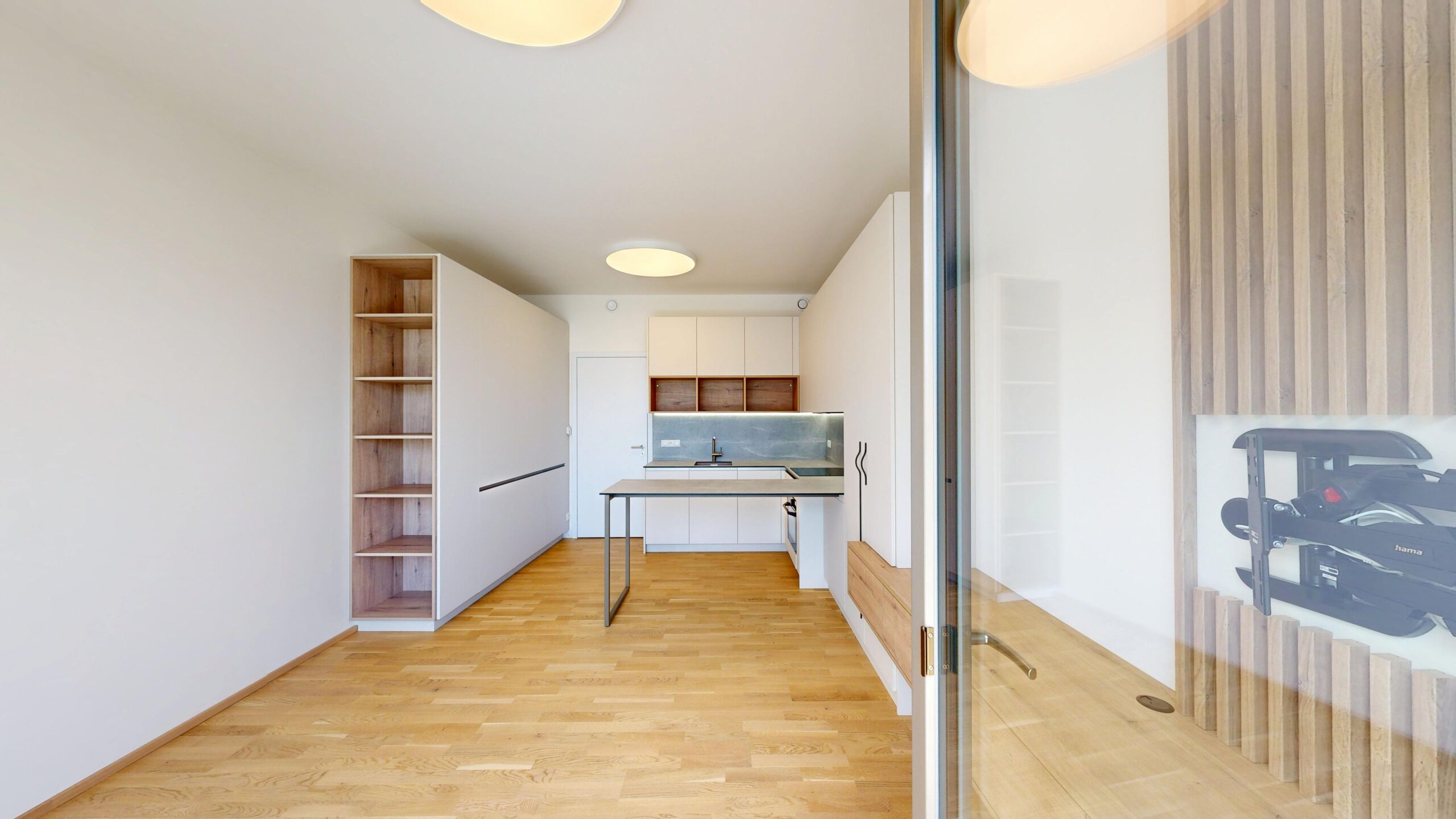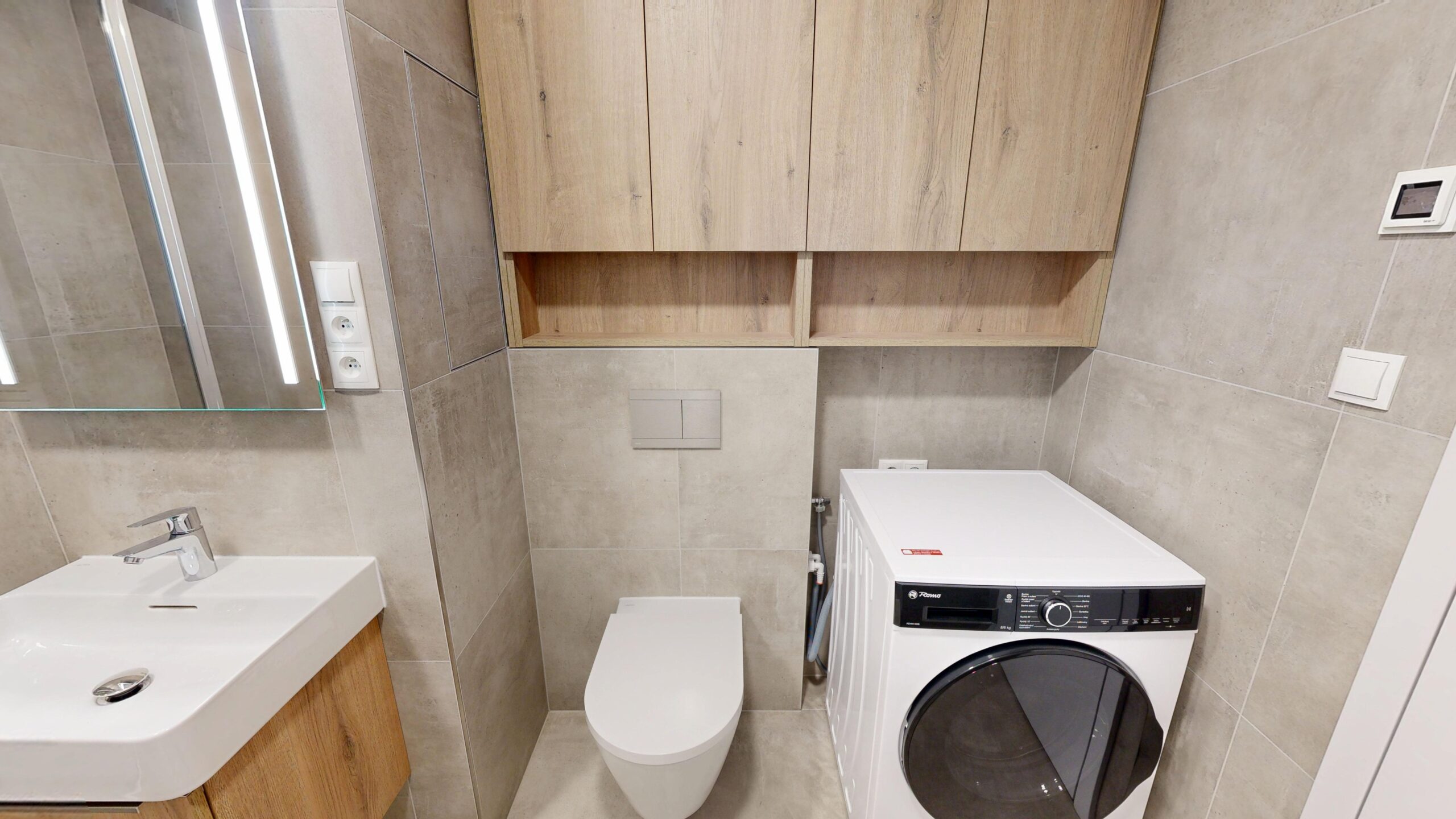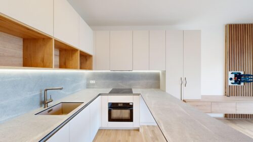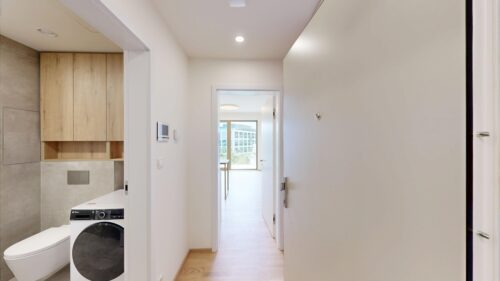 Kuchyňská linka včetně spotřebičů. Lednice s mrazákem, indukční deska, trouba, myčka nádobí, digestoř. Vestavěná skříň na chodbě, vestavěná skříň, televizní stěna. Kombinovaná pračka se sušičkou.