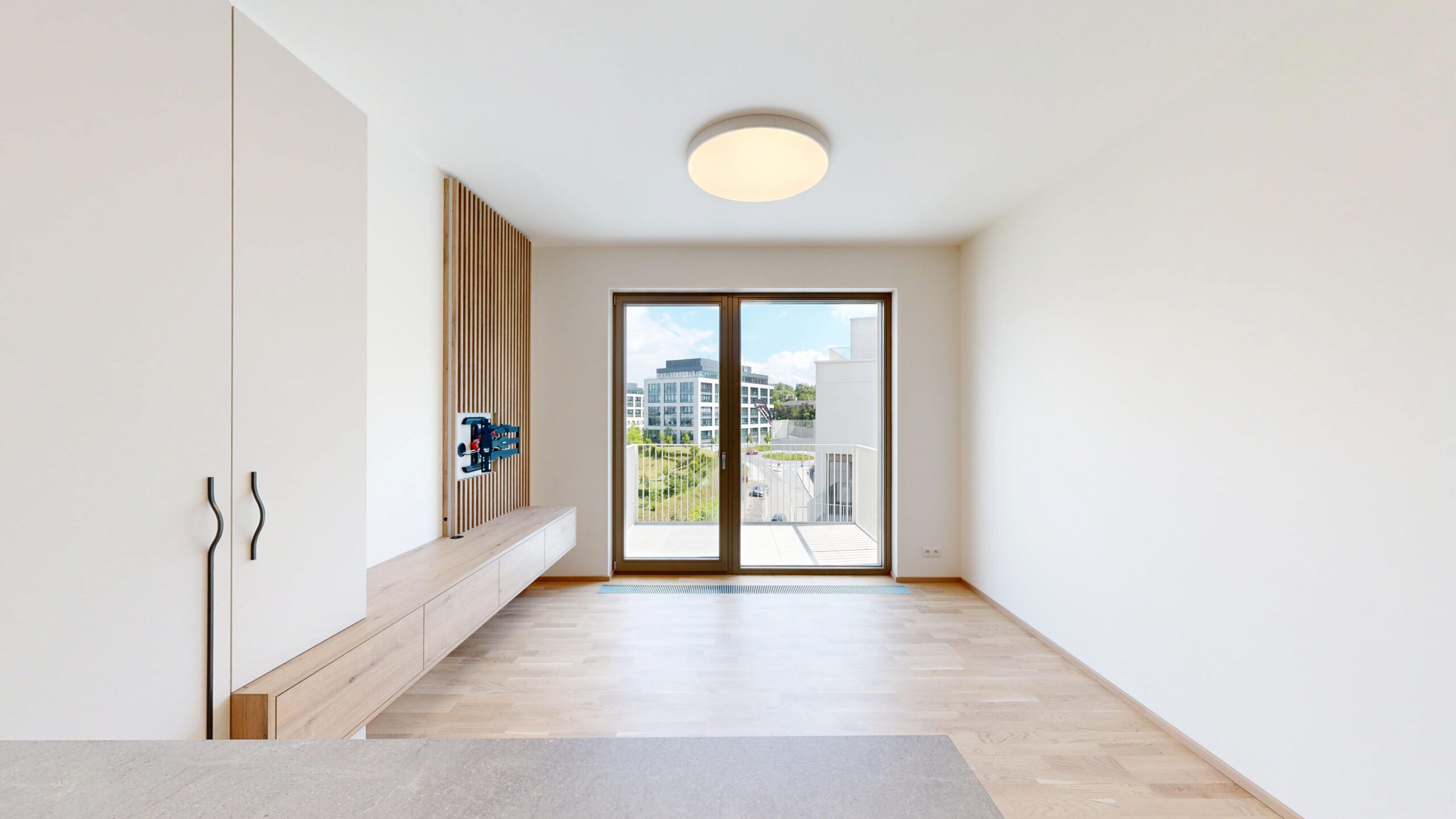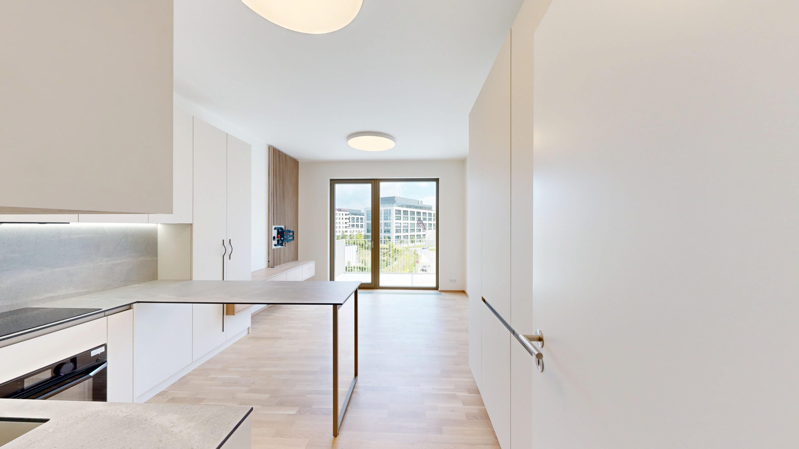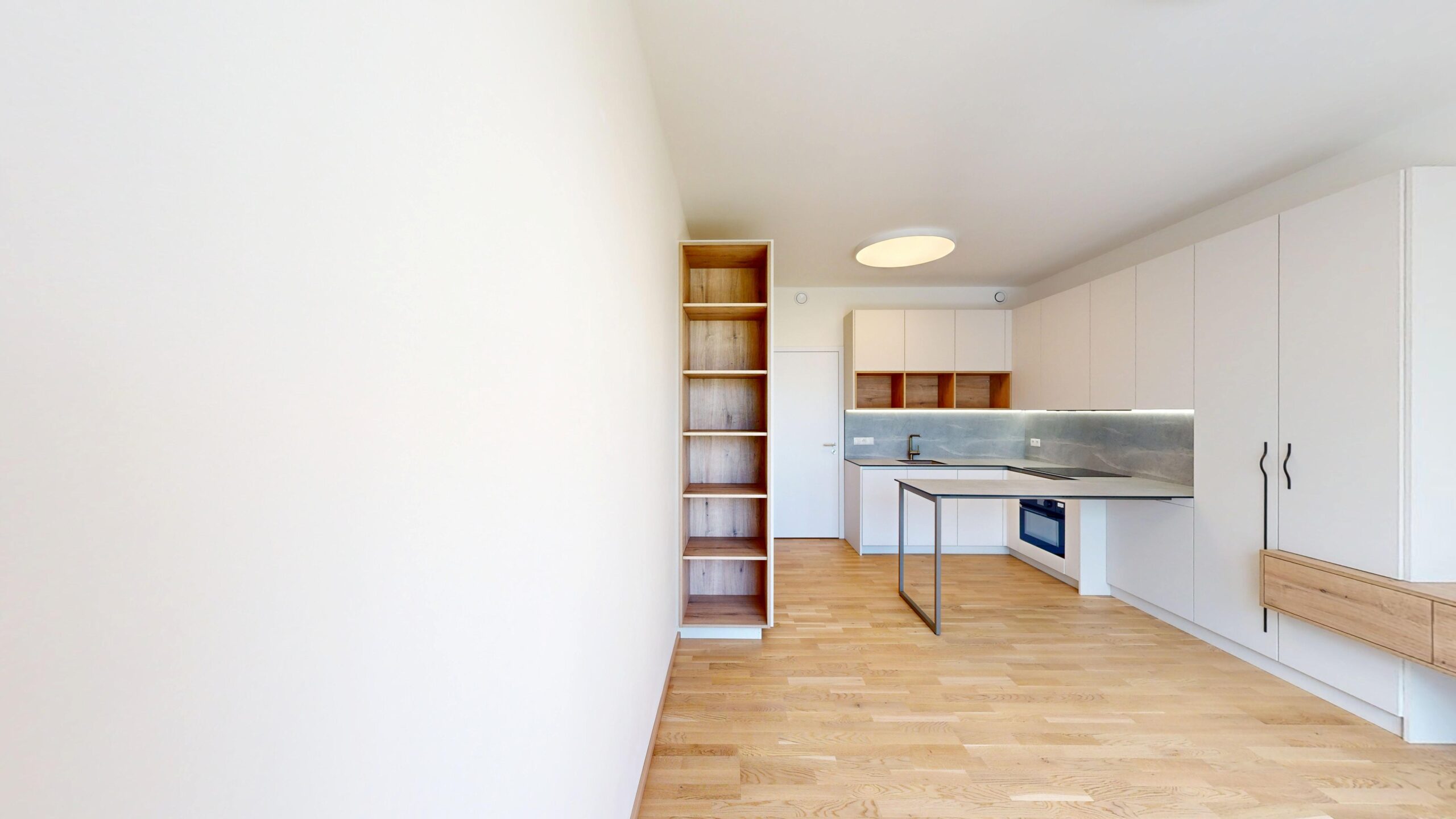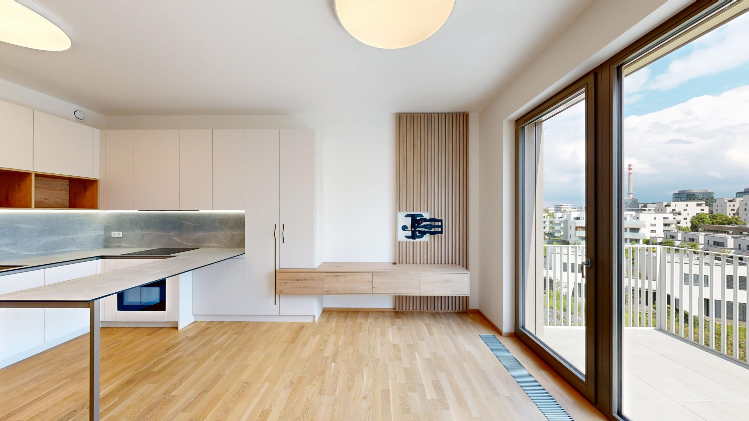 Kuchyňská linka včetně spotřebičů. Lednice s mrazákem, indukční deska, trouba, myčka nádobí, digestoř. Vestavěná skříň na chodbě, vestavěná skříň, televizní stěna. Kombinovaná pračka se sušičkou.