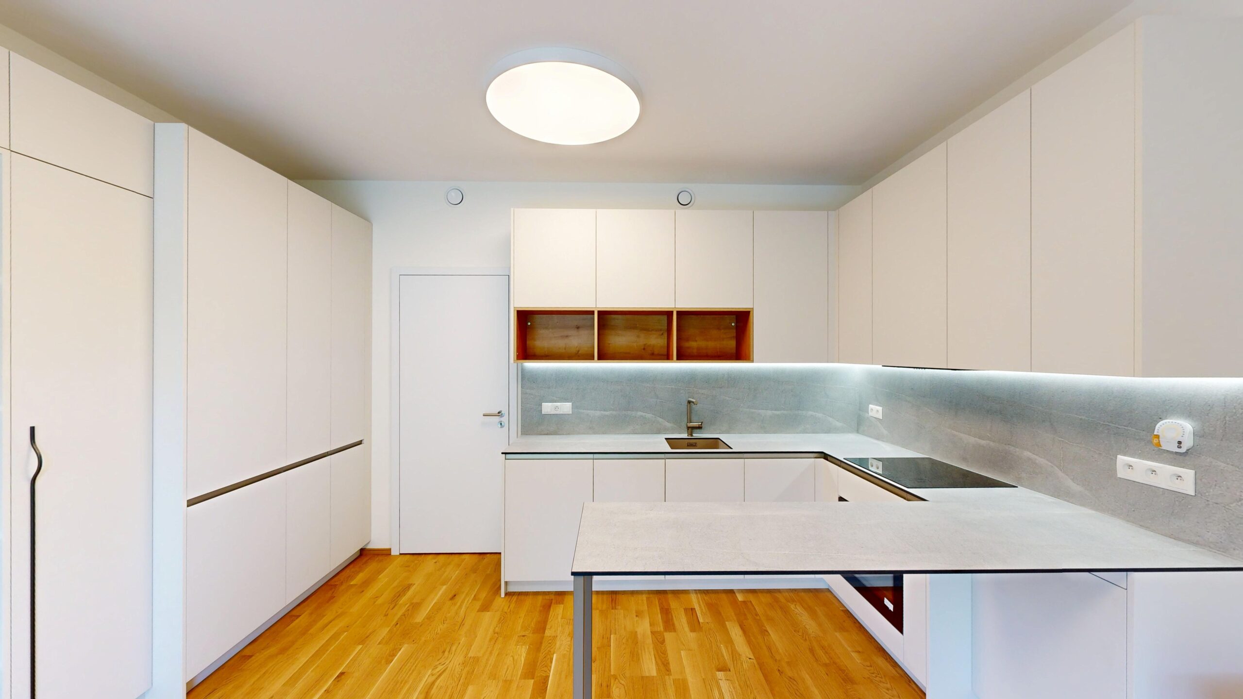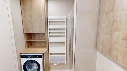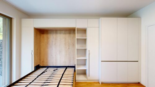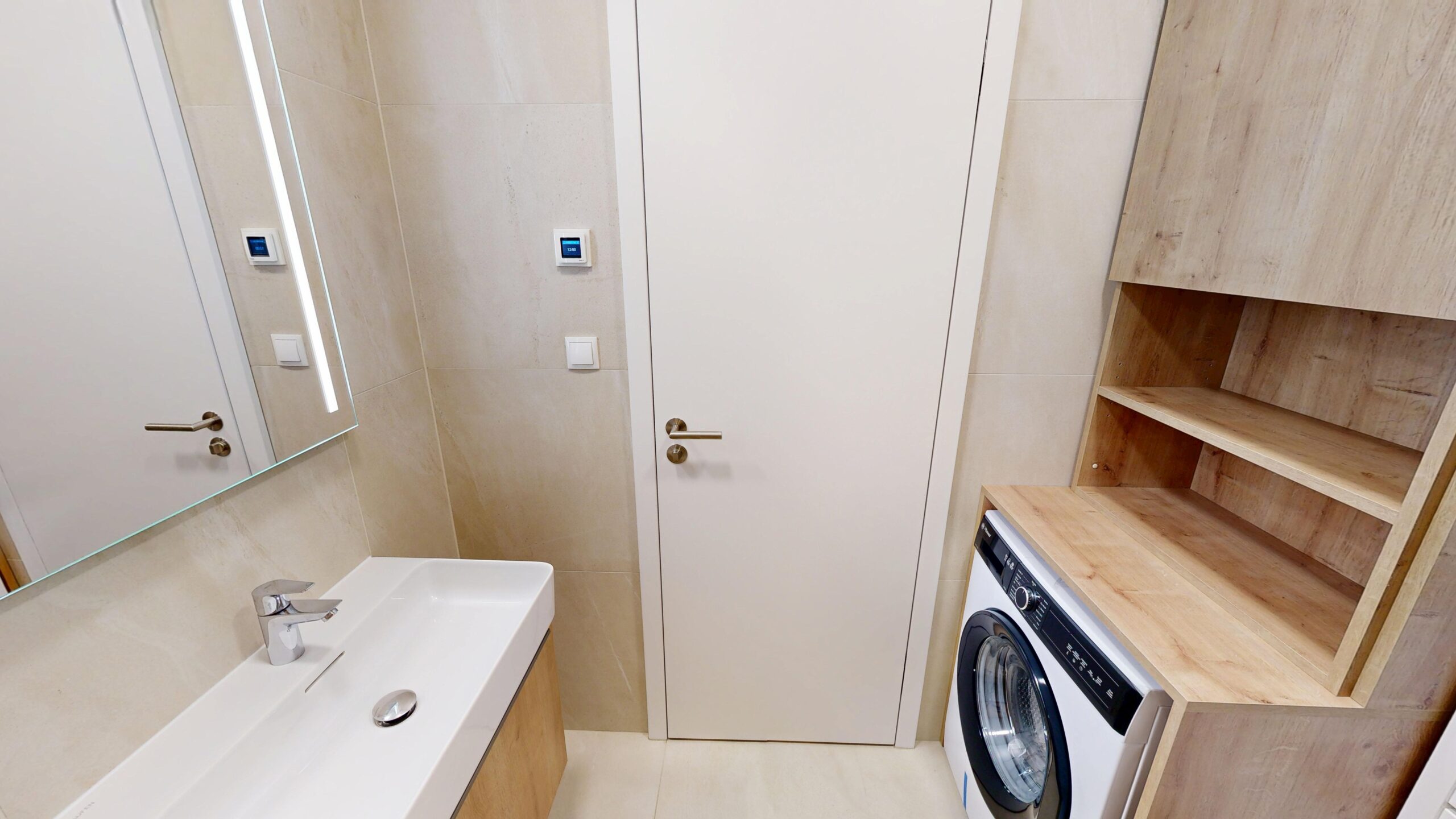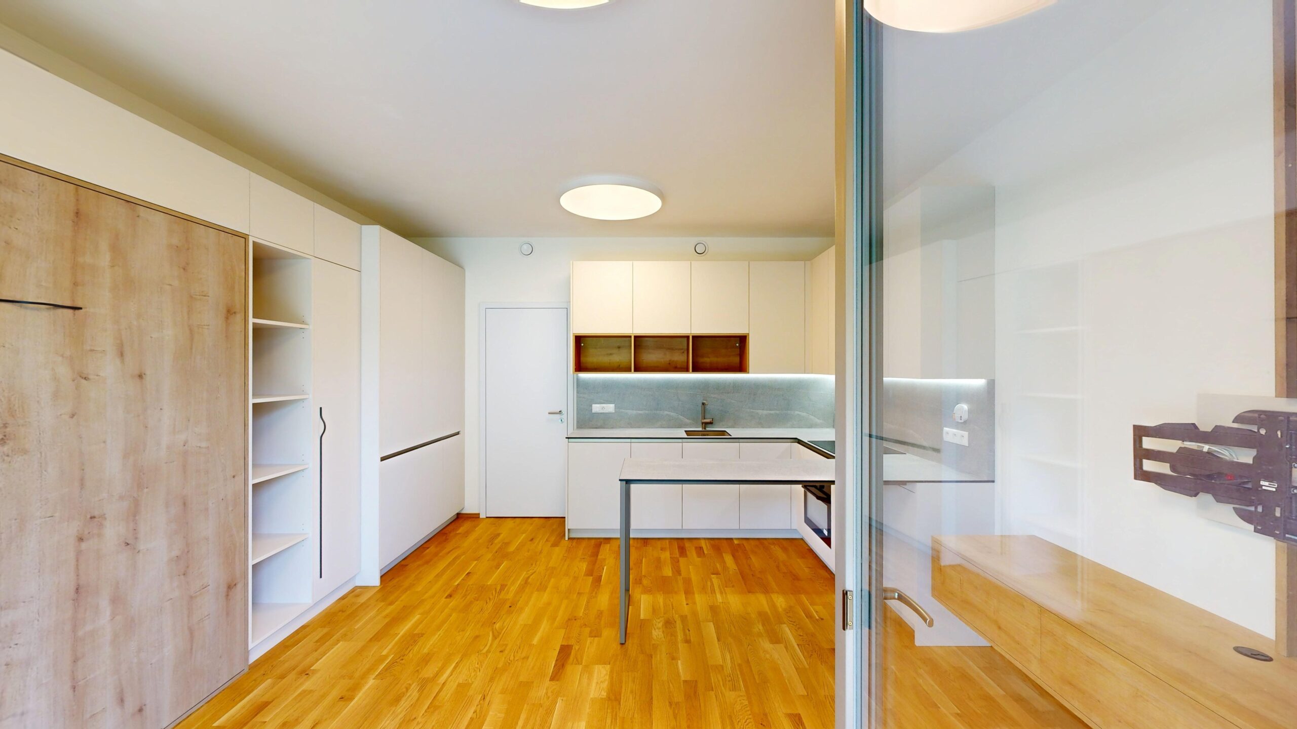 Kuchyňská linka včetně spotřebičů. Lednice s mrazákem, indukční deska, trouba, myčka nádobí, digestoř. Vestavěná skříň na chodbě, vestavěna rozkládací postel, televizní stěna. Kombinovaná pračka se sušičkou.