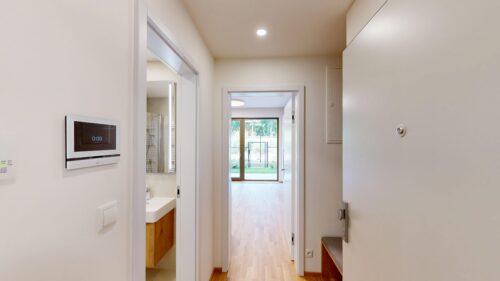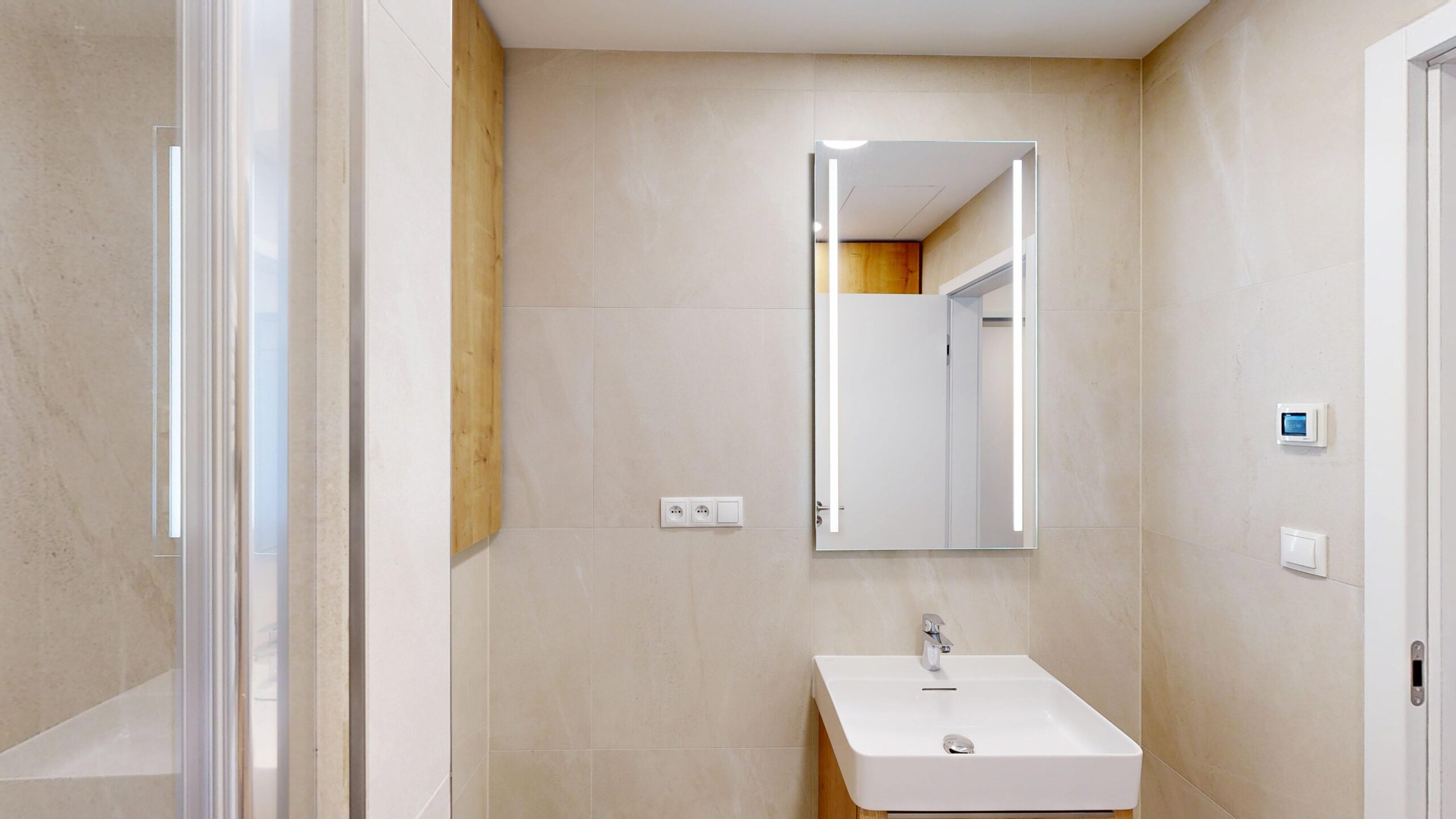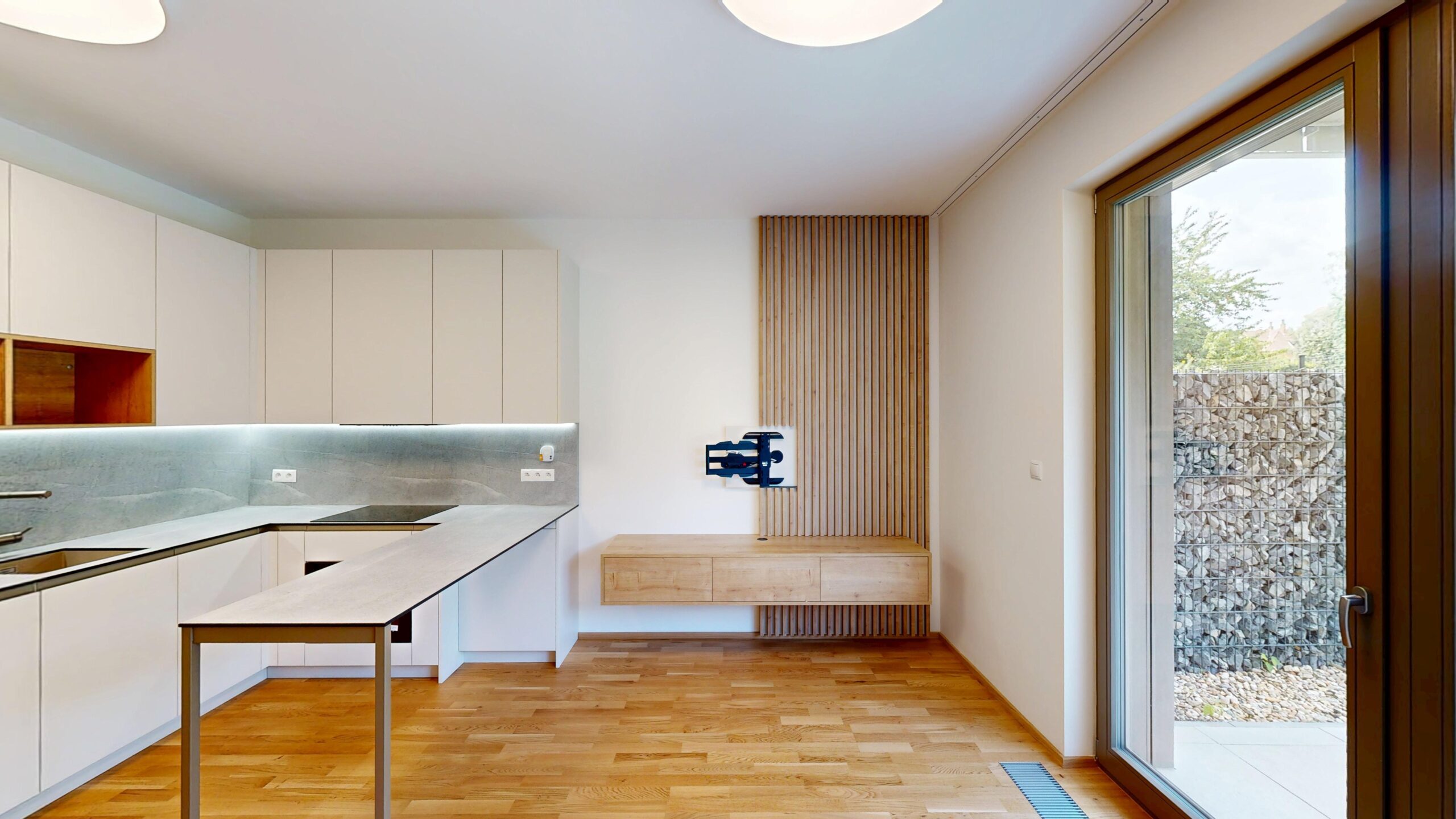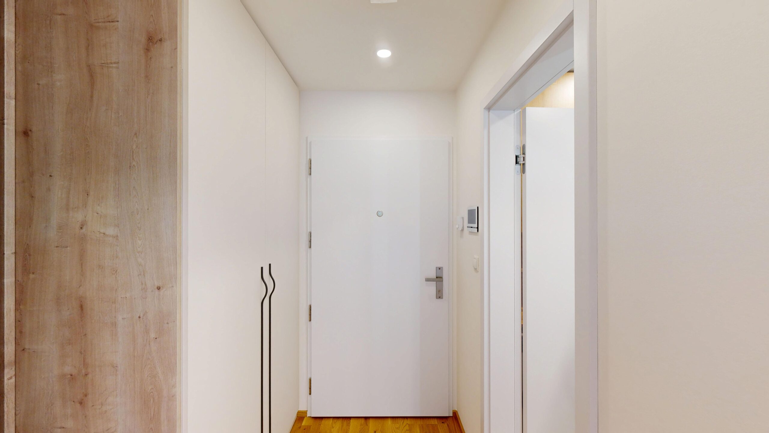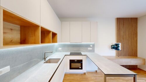 Kuchyňská linka včetně spotřebičů. Lednice s mrazákem, indukční deska, trouba, myčka nádobí, digestoř. Vestavěná skříň na chodbě, vestavěna rozkládací postel, televizní stěna. Kombinovaná pračka se sušičkou.