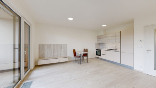 Byt k pronájmu o velikosti 36 m2 je umístěný ve 2. nadzemním podlaží s balkónem o velikosti 8 m2. Prosluněný obývací pokoj s televizní stěnou a s kompletně zařízenou kuchyní (lednice s mrazákem, digestoř, varná deska, trouba, myčka, mikrovlnná trouba) a jídelním stolem s židlemi. Vstupní chodba s botníkem a šatní skříní, koupelna se sprchovým koutem a toaletou.