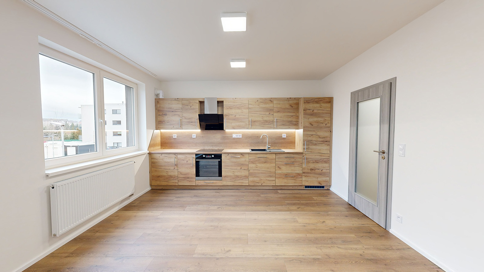 Nabízíme k pronájmu byt 2+kk o rozloze 57 m², situovaný v příjemném prostředí novostavby. K bytu náleží rovněž balkon a sklep. Byt se nachází v 1.NP a jeho dispozice zahrnuje: vstupní chodbu s vestavěnou skříní, samostatné WC, velký obývací pokoj s moderně vybaveným kuchyňským koutem (lednice s mrazákem, myčka, trouba, indukční deska, digestoř) a vstupem na balkon, dva pokoje a koupelnu s vanou. Díky bezbariérovému vstupu a výtahu je dům přístupný pro všechny.