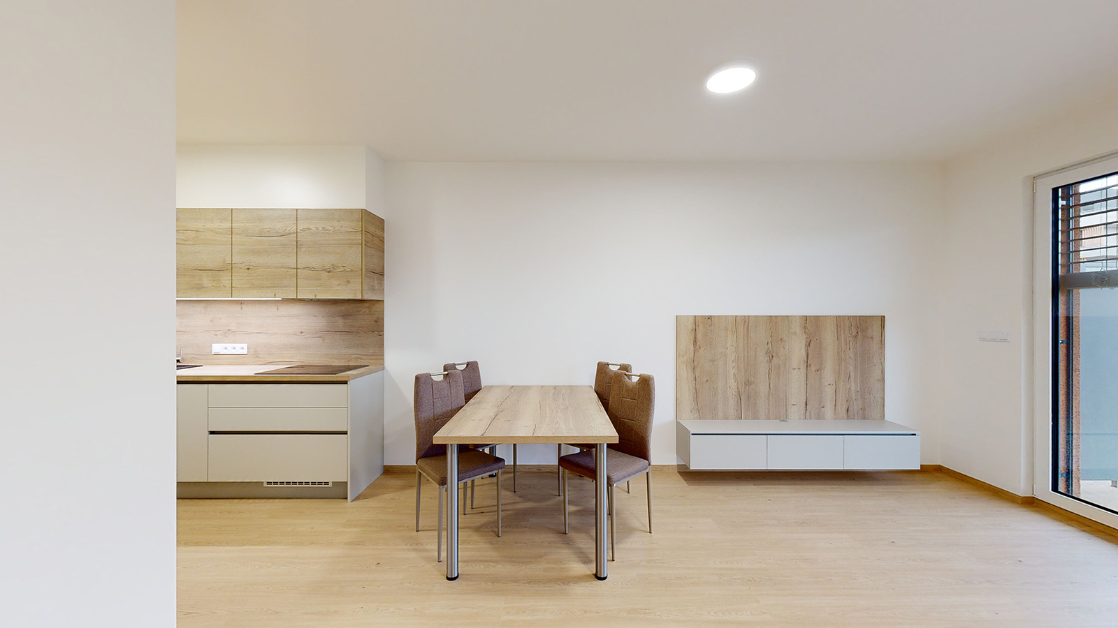 Kuchyňská linka včetně spotřebičů. Lednice s mrazákem, indukční deska, trouba, myčka nádobí, digestoř. Stůl, 4 židle, televizní stěna. Vestavěná šatní skříň v ložnci . Vestavěná šatní skříň s botníkem na chodbě.
