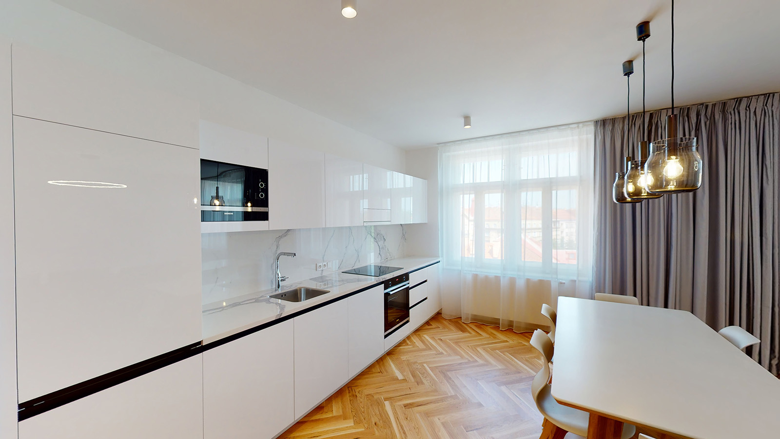 Luxusně zařízený mezonetový byt k pronájmu v ulici Jaselská je skvělá volba pro ty, kteří mají styl. Bydlete v Dejvicích, pražské čtvrti s neopakovatelnou rezidenční atmosférou. Mezonetový byt k pronájmu o velikosti 101,9 m2 se nachází v 5. a 6. podlaží a nabízí vám maximální soukromí. Přízemí bytu dominuje velkorysý obývací pokoj s jídelnou a kompletně zařízenou kuchyní (digestoř, varná deska, trouba, myčka značky Siemens), ložnice, koupelna s vanou a samostatná toaleta. V druhé patře bytu se nachází klimatizovaná ložnice, koupelna se sprchovým koutem, bidetem a toaletou. Celý byt k pronájmu je vybavený klimatizací, designovým nábytkem a doplňky, zabudovanými skříněmi na míru, luxusní sanitou Laufen, kombinovanou pračkou se sušičkou, okna chrání zastínění pro slunci. Pražská čtvrť Dejvice je krásným místem k životu, kde najdete vše, co potřebujete. Restaurace, bistra a bary s domácí atmosférou, mezinárodní školky, školy a elitní gymnázia. Relax vám zajistí věčně zelená Královská obora Stromovka, Letná nebo přírodní park Šárka. Zastávka metra a tramvají Hradčanská je vzdálena od bytu 3 minuty chůze.